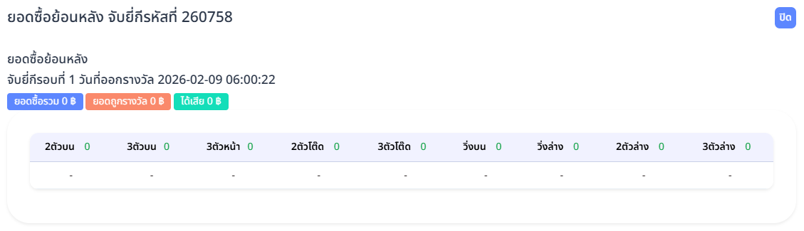 เมื่อผู้ดูแลระบบกดปุ่ม ดูรายละเอียด ในรายการประวัติการออกผลรางวัล ระบบจะแสดงหน้าต่าง ยอดซื้อย้อนหลัง ของงวดหรือรอบที่เลือก เพื่อใช้ตรวจสอบข้อมูลสรุปยอดการเดิมพันของสมาชิกในรอบนั้น