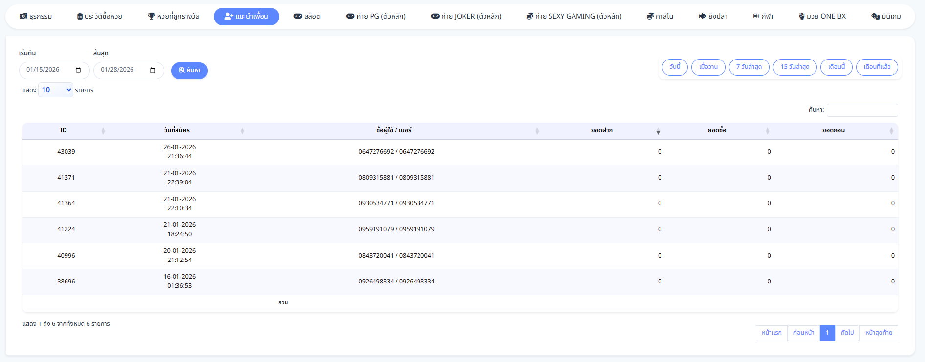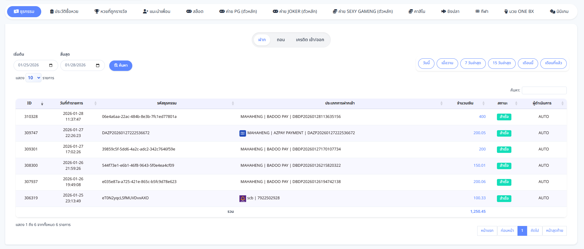 หน้าจอนี้ใช้สำหรับ ตรวจสอบประวัติการฝากเงินของผู้ใช้งาน โดยจะแสดงรายละเอียดการฝากเงินทั้งหมดตามช่วงเวลาที่เลือก พร้อมสถานะและจำนวนเงินของแต่ละรายการ