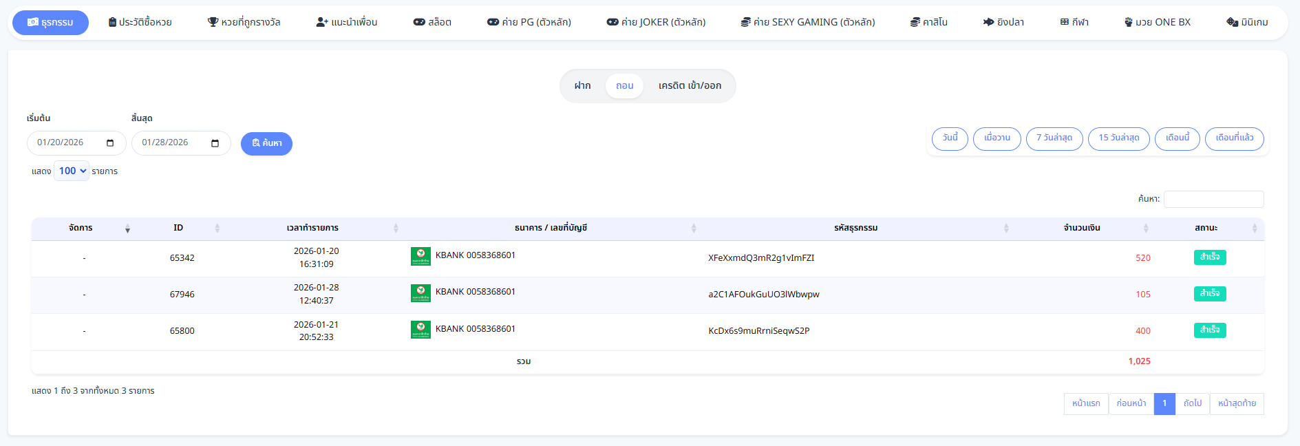 หน้าจอนี้ใช้สำหรับ แสดงประวัติการถอนเงินของผู้ใช้งาน โดยสามารถตรวจสอบรายละเอียดการถอนเงินแต่ละรายการ เช่น วันที่ทำรายการ บัญชีธนาคาร จำนวนเงิน และสถานะของรายการถอน