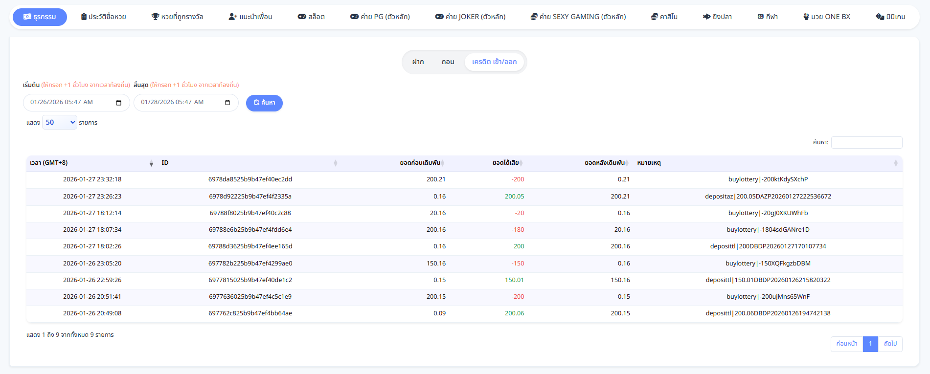 หน้าจอนี้ใช้สำหรับ ตรวจสอบประวัติการเปลี่ยนแปลงเครดิตของผู้ใช้งาน ทั้งกรณีเครดิตเพิ่ม (เข้า) และเครดิตลด (ออก) เช่น การฝากเงิน การถอนเงิน การเล่นเกม หรือการทำรายการอื่น ๆ ที่ส่งผลต่อยอดเครดิตในระบบ