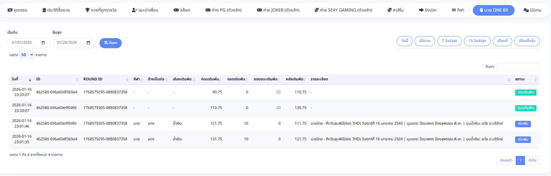 เมนู มวย ONE BX ใช้สำหรับแสดงประวัติการเดิมพันมวยของผู้ใช้งาน โดยระบบจะแสดงรายละเอียดการวางเดิมพัน ผลการเดิมพัน และการเปลี่ยนแปลงของเครดิตในแต่ละรายการ เพื่อให้ผู้ใช้งานสามารถตรวจสอบข้อมูลย้อนหลังได้อย่างถูกต้องและโปร่งใส
