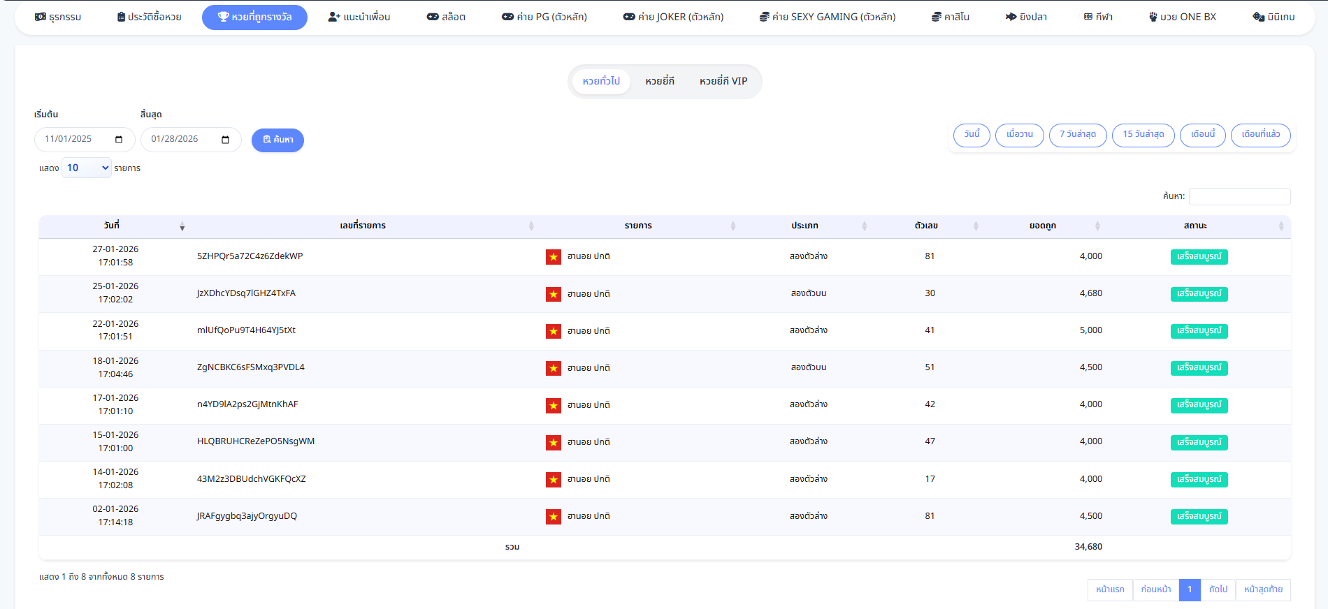 - วันที่ : วันและเวลาที่ทำรายการเดิมพัน