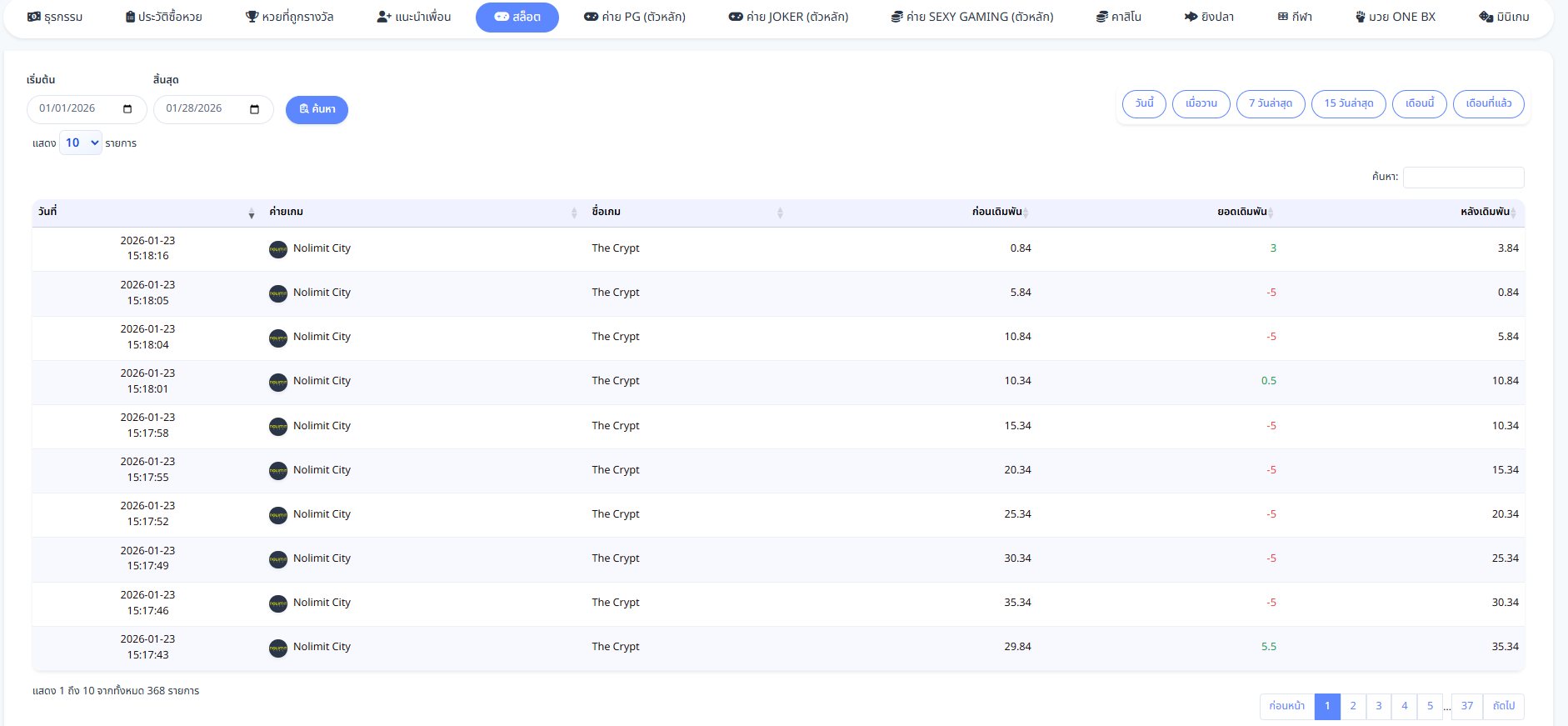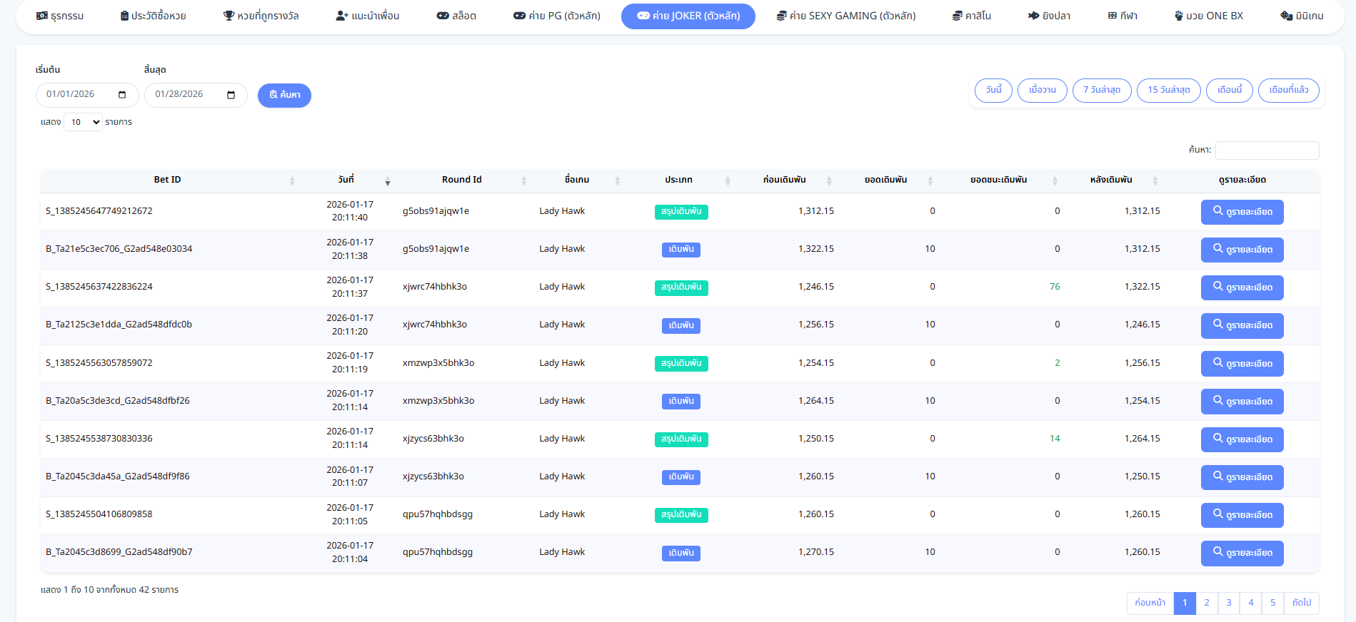 เมนู ค่าย JOKER (ตัวหลัก) ใช้สำหรับแสดงประวัติการเล่นเกมจากค่าย JOKER ของผู้ใช้งาน โดยระบบจะแสดงรายละเอียดธุรกรรมการเล่นในแต่ละรอบอย่างครบถ้วน เพื่อให้ผู้ใช้งานสามารถตรวจสอบการเปลี่ยนแปลงของเครดิตก่อนและหลังการเดิมพันได้อย่างชัดเจน