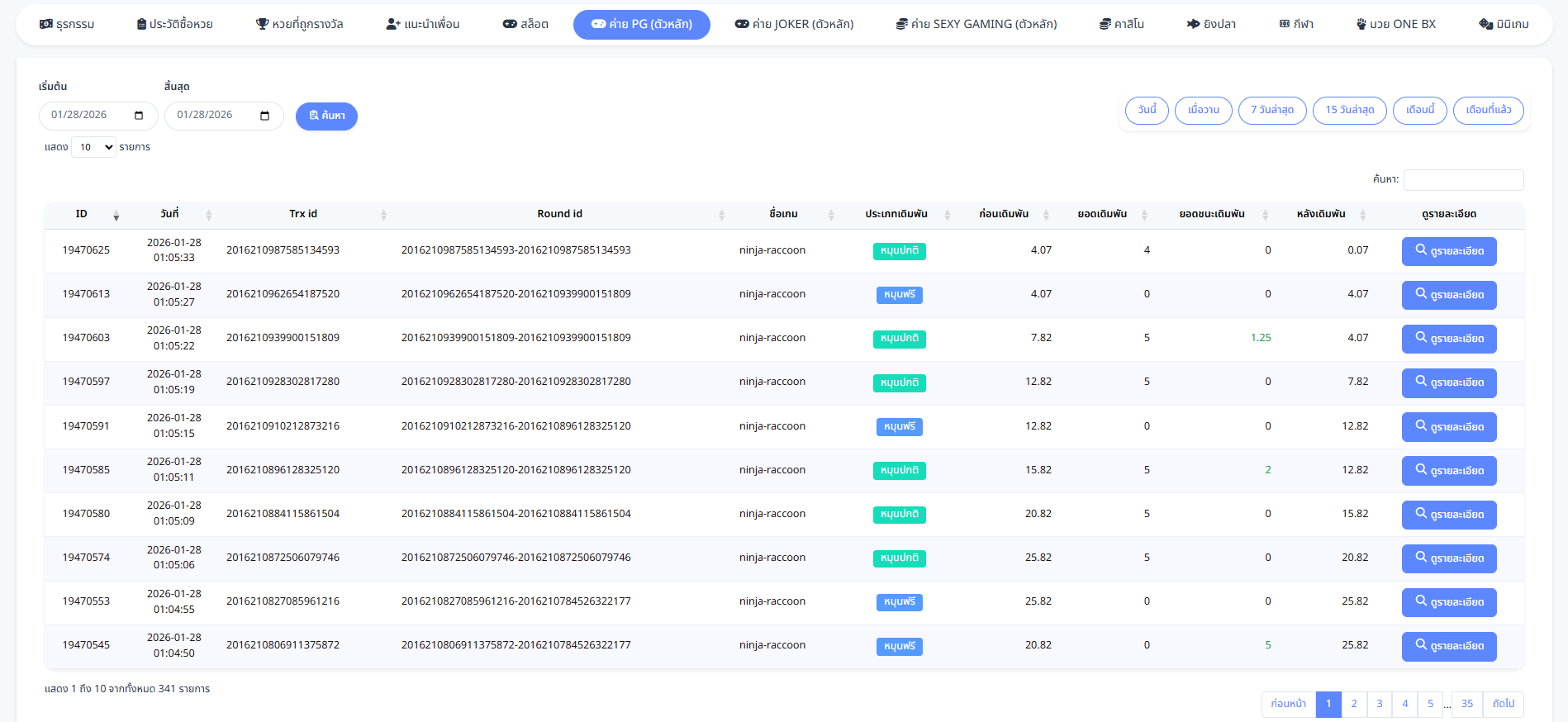 เมนู ค่าย PG (ตัวหลัก) ใช้สำหรับแสดงประวัติการเล่นเกมจากค่าย PG ของผู้ใช้งาน โดยระบบจะแสดงรายละเอียดธุรกรรมการเล่นแต่ละรอบอย่างละเอียด เพื่อให้สามารถตรวจสอบการเคลื่อนไหวของเครดิตได้อย่างถูกต้องและโปร่งใส