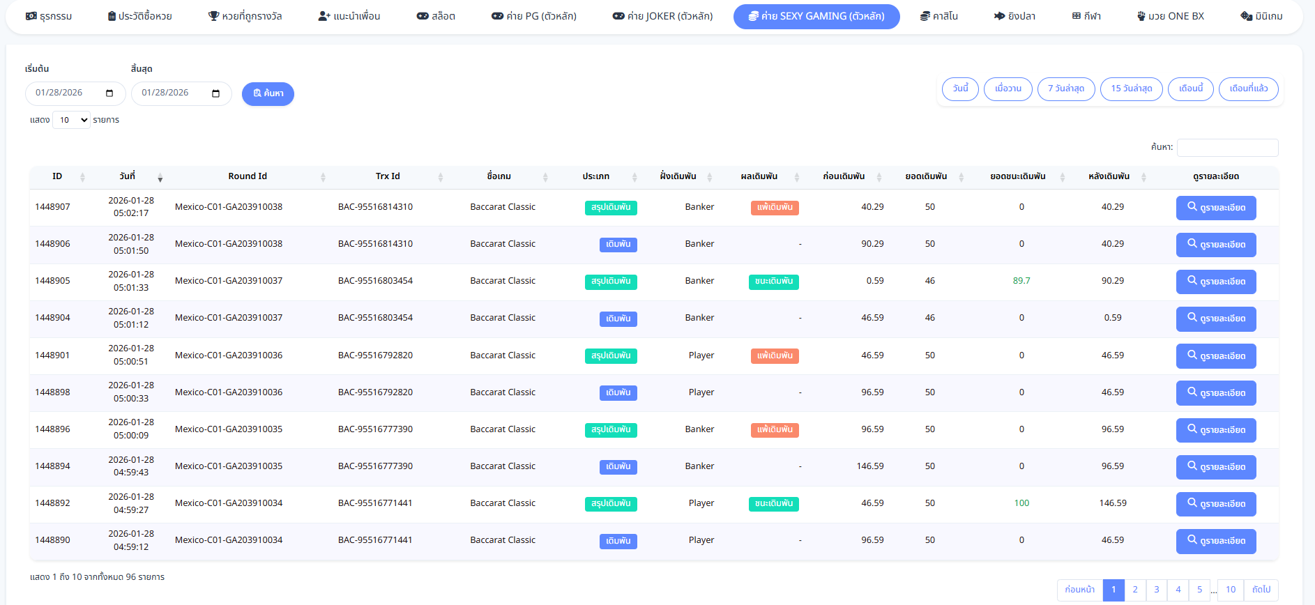 ตารางจะแสดงข้อมูลธุรกรรมการเล่นเกมจากค่าย SEXY GAMING โดยมีรายละเอียดดังนี้