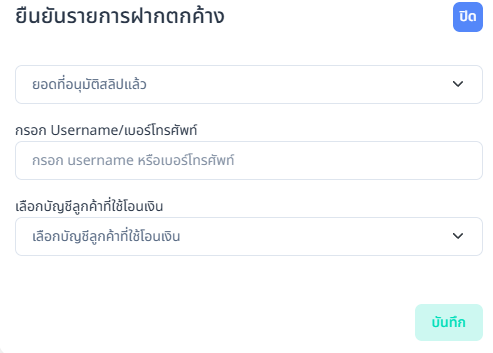 หน้าจอนี้ใช้สำหรับผู้ดูแลระบบในการตรวจสอบและยืนยันรายการฝากเงินที่ระบบยังไม่สามารถจับคู่หรือประมวลผลได้อัตโนมัติ โดยผู้ดูแลสามารถเลือกประเภทยืนยันรายการ กรอกข้อมูลลูกค้า และผูกบัญชีผู้ใช้ เพื่อให้ระบบดำเนินการต่อได้อย่างถูกต้อง