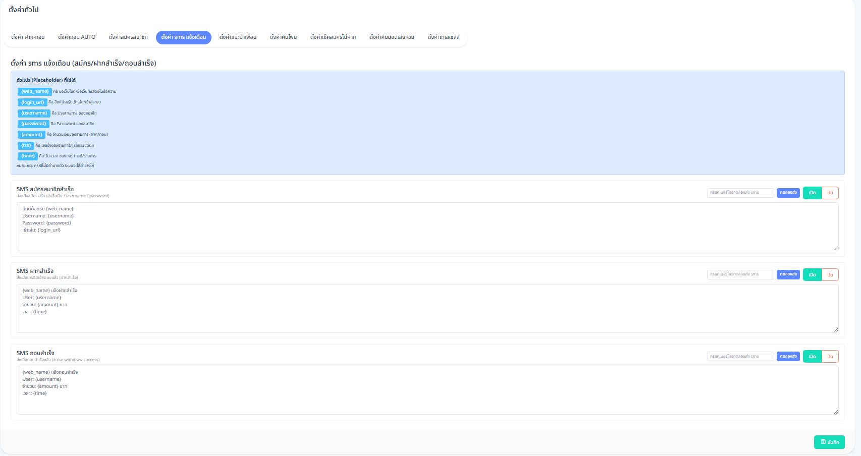 เมนู ตั้งค่า SMS แจ้งเตือน ใช้สำหรับกำหนดรูปแบบข้อความ SMS ที่ระบบจะส่งแจ้งเตือนให้สมาชิกในกรณีต่าง ๆ เช่น สมัครสมาชิกสำเร็จ ฝากเงินสำเร็จ และถอนเงินสำเร็จ โดยสามารถปรับแต่งเนื้อหาข้อความได้ตามต้องการผ่านตัวแปร (Placeholder)