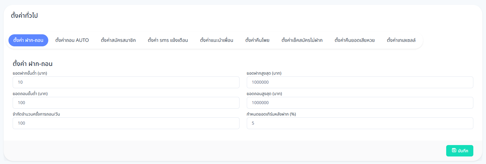 หลังจากตั้งค่าต่าง ๆ เรียบร้อยแล้ว ให้คลิกปุ่ม บันทึก เพื่อยืนยันการตั้งค่าและเริ่มใช้งานระบบถอนเงินอัตโนมัติ