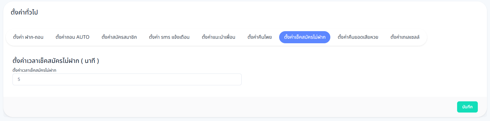 เมนู ตั้งค่าเช็คสมัครไม่ฝาก ใช้สำหรับกำหนดระยะเวลาในการตรวจสอบสมาชิกที่สมัครแล้วแต่ยังไม่มีการฝากเงิน เพื่อให้ระบบสามารถจัดการสิทธิ์หรือเงื่อนไขต่าง ๆ ของสมาชิกกลุ่มนี้ได้อย่างเหมาะสม