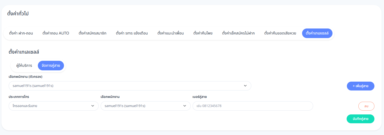 ระบุพนักงานที่ต้องการผูกกับหมายเลขโทรศัพท์ - เบอร์คู่สาย