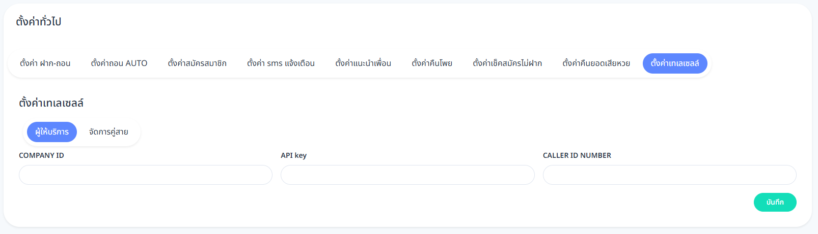 ใช้กรอกคีย์สำหรับเชื่อมต่อระบบ (API) ที่ได้รับจากผู้ให้บริการ - CALLER ID NUMBER