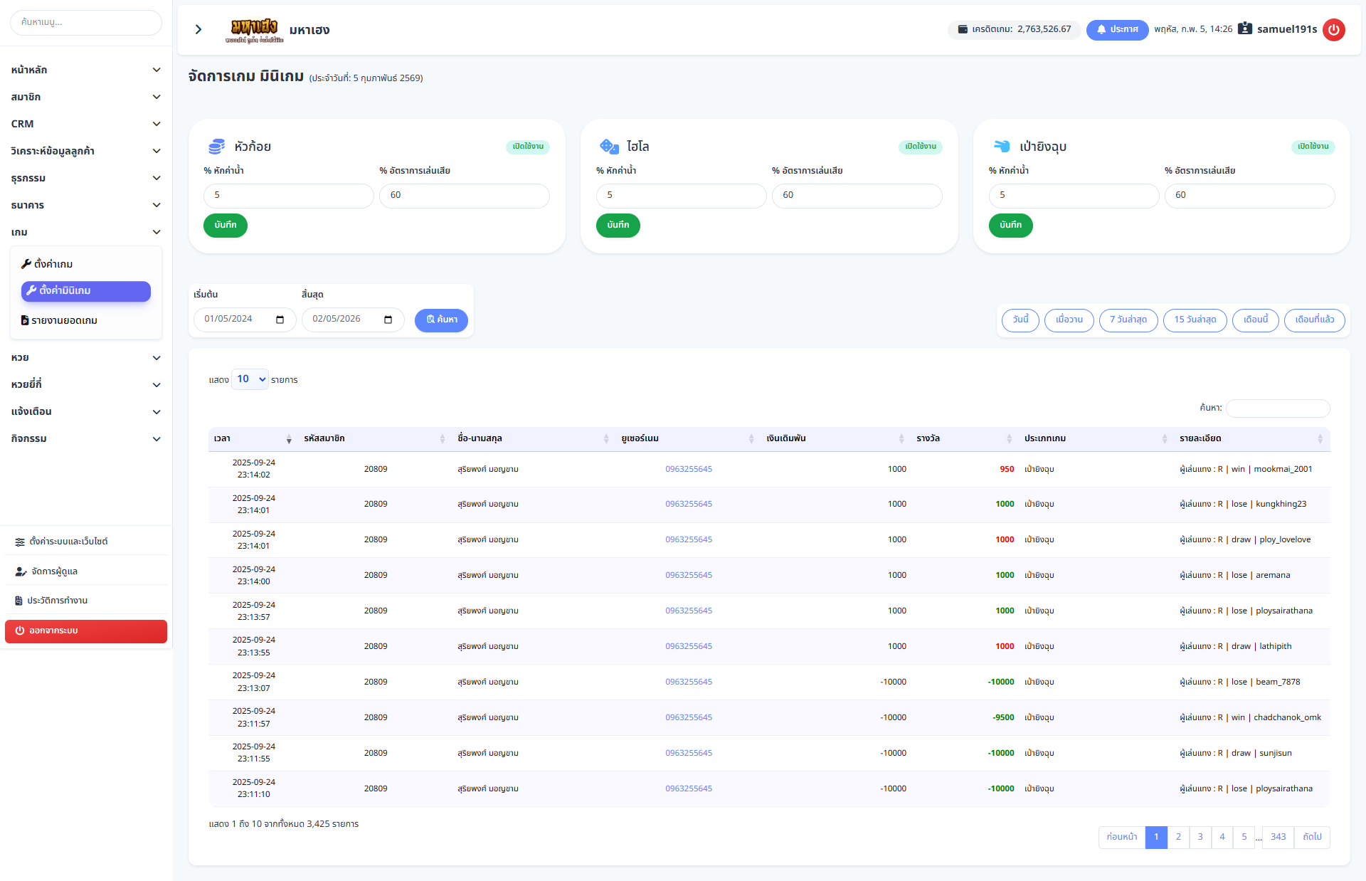 หน้าเมนู จัดการเกม มินิเกม ใช้สำหรับกำหนดค่าและควบคุมการทำงานของมินิเกมภายในระบบ ผู้ดูแลระบบสามารถตั้งค่าอัตราการหักกำไร เปิด–ปิดการใช้งานมินิเกม และตรวจสอบประวัติการเล่นของสมาชิกได้