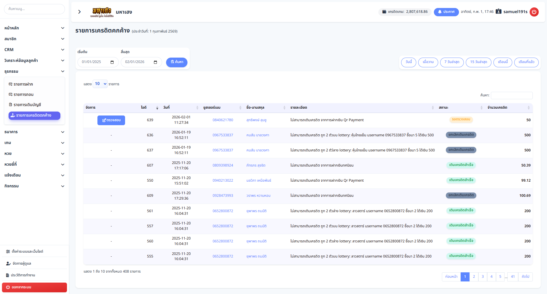 หน้า รายการเครดิตตกค้าง ใช้สำหรับแสดงรายการเครดิตที่ไม่สามารถตัดหรือปรับยอดเข้าระบบได้สำเร็จ เพื่อให้ผู้ดูแลระบบสามารถตรวจสอบสาเหตุ ติดตามสถานะ และจัดการเครดิตที่คงค้างอยู่ในระบบได้อย่างถูกต้อง