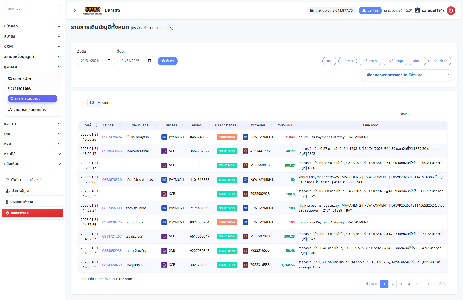 หน้า รายการเดินบัญชี ใช้สำหรับแสดงประวัติการเคลื่อนไหวของเงินในระบบทั้งหมด ทั้งรายการฝากและรายการถอน เพื่อให้ผู้ดูแลสามารถตรวจสอบความถูกต้องของธุรกรรม การเปลี่ยนแปลงยอดเงิน และใช้เป็นข้อมูลอ้างอิงทางบัญชีได้อย่างครบถ้วน