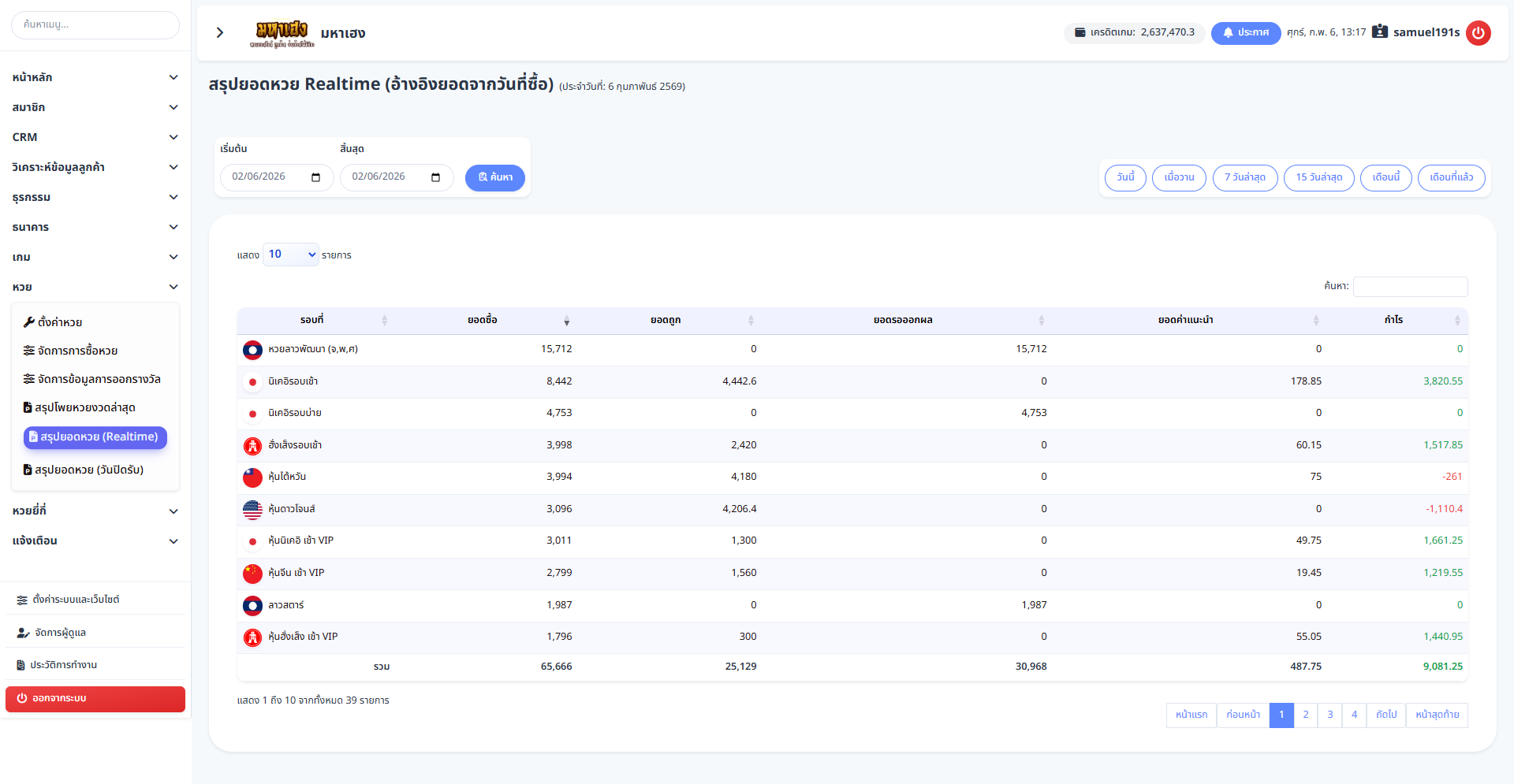 หน้าเมนู สรุปยอดหวย Realtime ใช้สำหรับแสดงข้อมูลสรุปยอดซื้อ–ยอดจ่ายของหวยทุกประเภทแบบเรียลไทม์ โดยอ้างอิงจากวันที่สมาชิกทำรายการซื้อ เพื่อให้ผู้ดูแลระบบสามารถติดตามผลประกอบการและกำไร–ขาดทุนของระบบได้อย่างใกล้ชิด