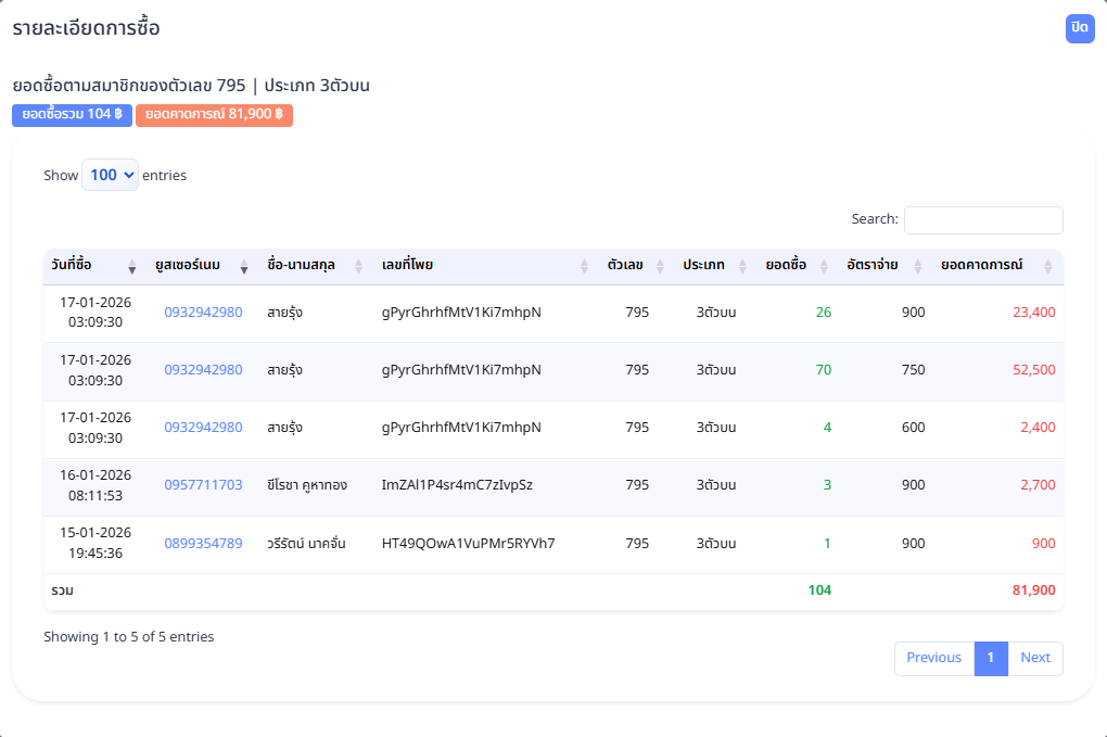 เมื่อผู้ดูแลระบบ คลิกที่ตัวเลขในตารางโพยหวย ระบบจะแสดงหน้า รายละเอียดการซื้อของตัวเลขนั้น เพื่อให้ตรวจสอบข้อมูลการซื้ออย่างละเอียด