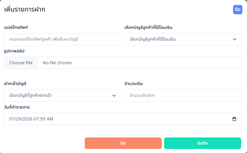 เมื่อผู้ใช้งานกดปุ่ม เพิ่มรายการฝาก ระบบจะแสดงหน้าจอสำหรับบันทึกรายการฝากเงินเข้าสู่ระบบด้วยตนเอง โดยใช้สำหรับกรณีที่สมาชิกโอนเงินเข้ามาแล้ว แต่ระบบอัตโนมัติไม่สามารถบันทึกรายการได้ หรือเป็นการดำเนินการตามนโยบายของผู้ดูแลระบบ